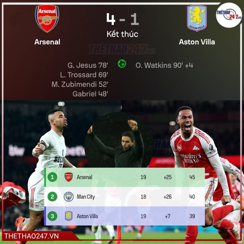Trở lại màn so tài giữa Arsenal vs Aston Villa, dù không có Rice, Zubimendi, Merino và Odegaard được sử dụng ở tuyến giữa trong sơ đồ 4-3-3 nhưng thầy trò Mikel Arteta đã chơi áp đảo đội khách và giành chiến thắng 4-1.
