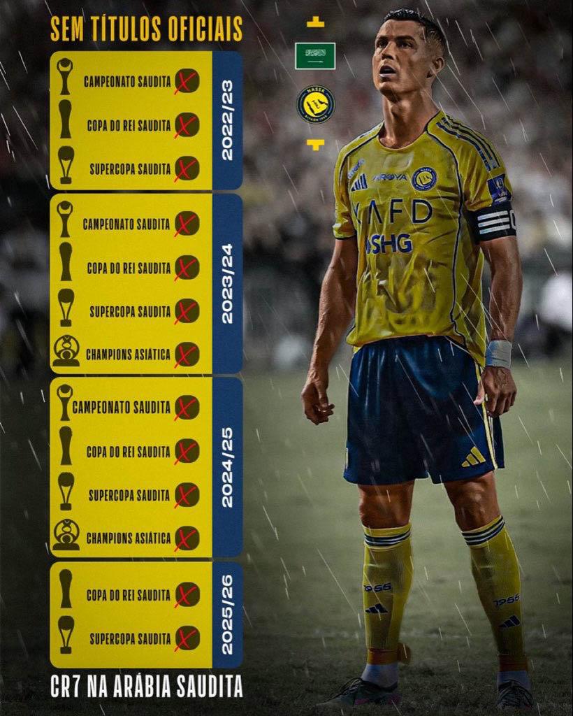Cristiano Ronaldo chưa có danh hiệu chính thức nào kể từ khi gia nhập CLB Al Nassr. Thật buồn cho siêu sao như CR7. Khi thời gian đá bóng không còn nhiều, danh hiệu cấp CLB chẳng hiểu vì sao lại cứ "lảng tránh" anh.