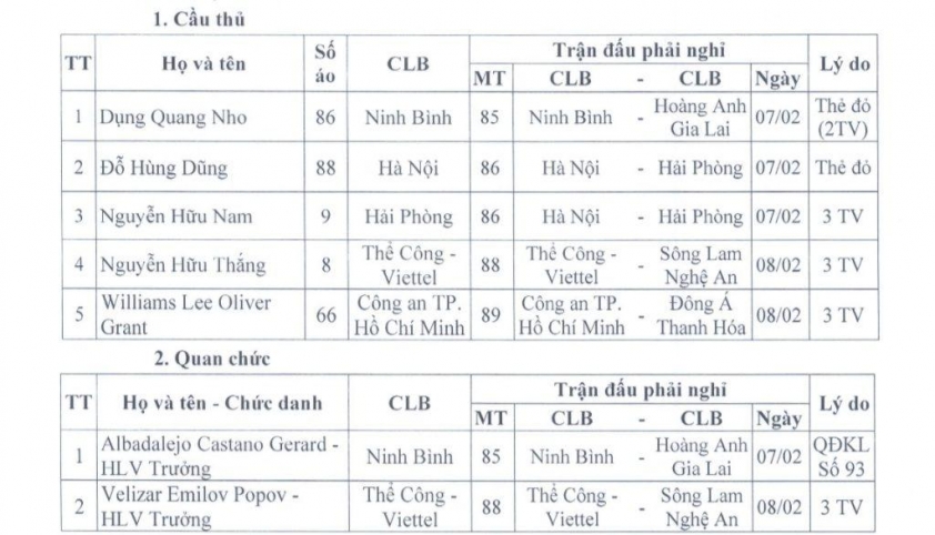 Theo thông báo chính thức của VPF, có 5 cầu thủ bị treo giò ở vòng 13 V.League 2025/26 do nhận thẻ đỏ ở vòng trước hoặc đã tích lũy đủ 3 thẻ vàng kể từ đầu mùa.