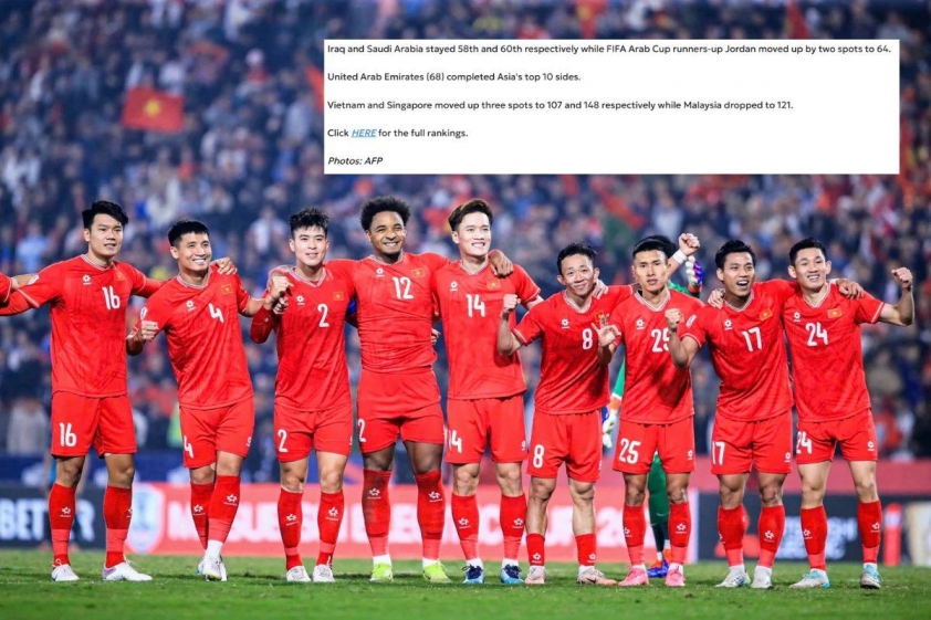 Theo bảng xếp hạng FIFA mới nhất công bố ngày 22/12, đội tuyển Việt Nam đã tăng 3 bậc, vươn lên vị trí 107 thế giới, qua đó đứng thứ 19 tại châu Á. Đáng chú ý, Việt Nam là đội tuyển có mức tăng thứ hạng cao nhất châu Á trong đợt cập nhật lần này, cho thấy những chuyển biến rõ nét dưới thời HLV Kim Sang Sik.
