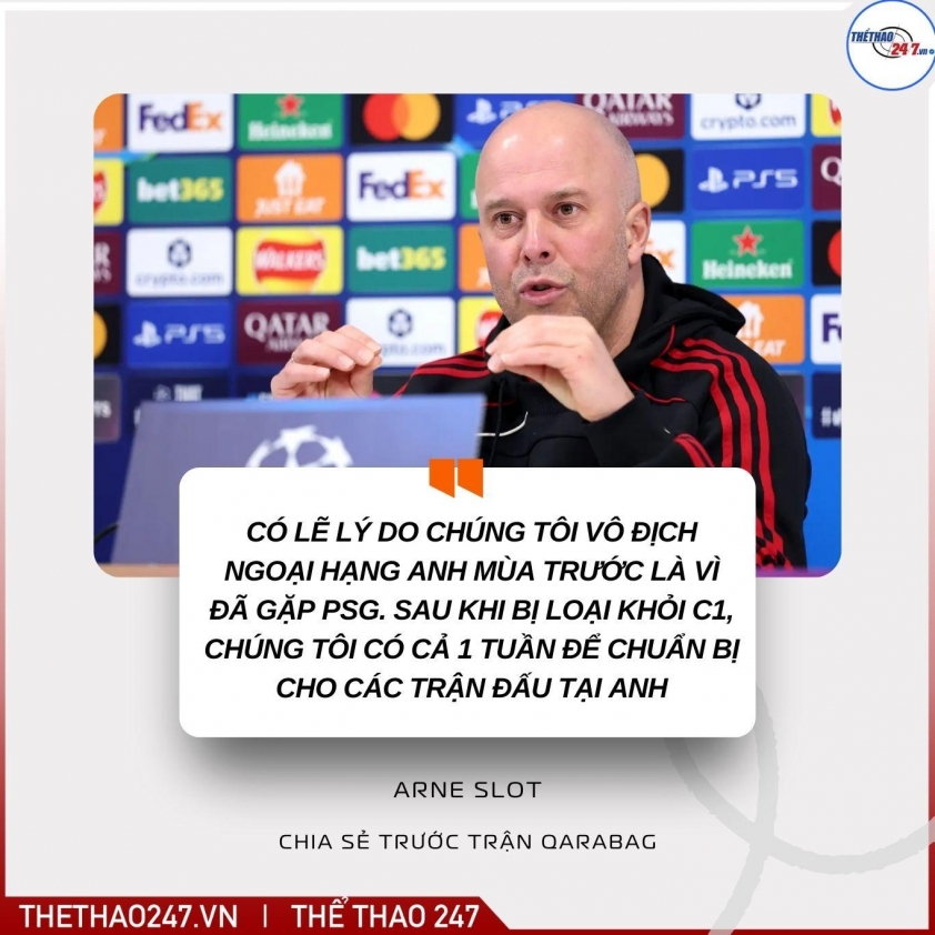 Trước trận gặp Qarabag, Slot chia sẻ với báo giới: “Có thể đây sẽ không phải là một quan điểm được ưa thích, nhưng có lẽ lý do chúng tôi vô địch giải đấu mùa trước là vì đã gặp Paris Saint-Germain. Sau khi bị loại khỏi Champions League, chúng tôi có cả một tuần để chuẩn bị cho các trận đấu tại Premier League.”