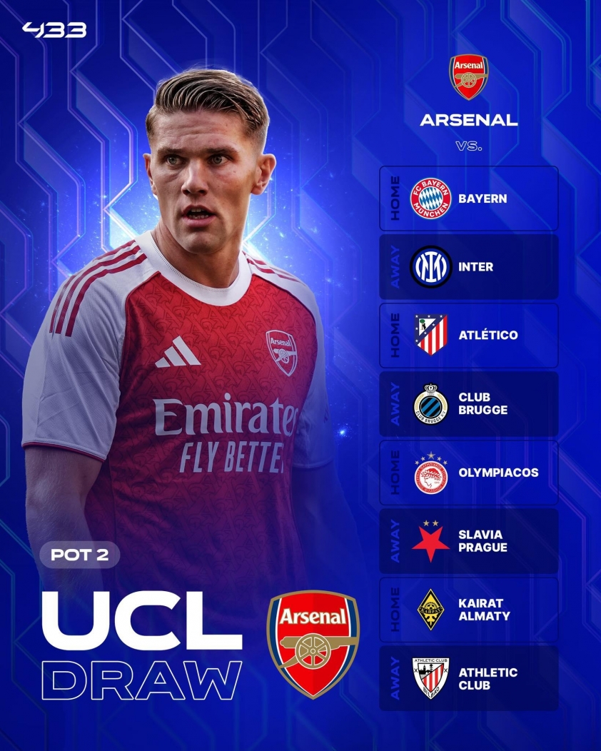 Tuần trước, Arsenal đã biết được các đối thủ của họ trong vòng phân hạng Champions League mùa này: Bayern Munich (sân nhà), Inter Milan (sân khách), Atletico Madrid (sân nhà), Club Brugge (sân khách), Olympiakos (sân nhà), Slavia Prague (sân khách), Kairat Almaty (sân nhà) và Athletic Bilbao (sân khách).
