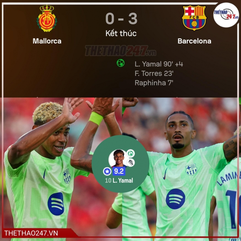 Trận đấu trên sân Palma chứng kiến kịch bản khá thuận lợi cho Barca. Ngay trong hiệp một, Mallorca đã tự làm khó mình khi nhận tới hai chiếc thẻ đỏ. Manu Morlanes bị truất quyền thi đấu sau tình huống tranh cãi gay gắt với trọng tài về bàn thắng mở tỉ số của Ferran Torres, trước khi phạm lỗi thô bạo với Lamine Yamal. Không lâu sau đó, Vedat Muriqi tiếp tục khiến đội chủ nhà lâm vào thế khó khi phạm lỗi với Eric Garcia, buộc Mallorca phải chơi với 9 người.
