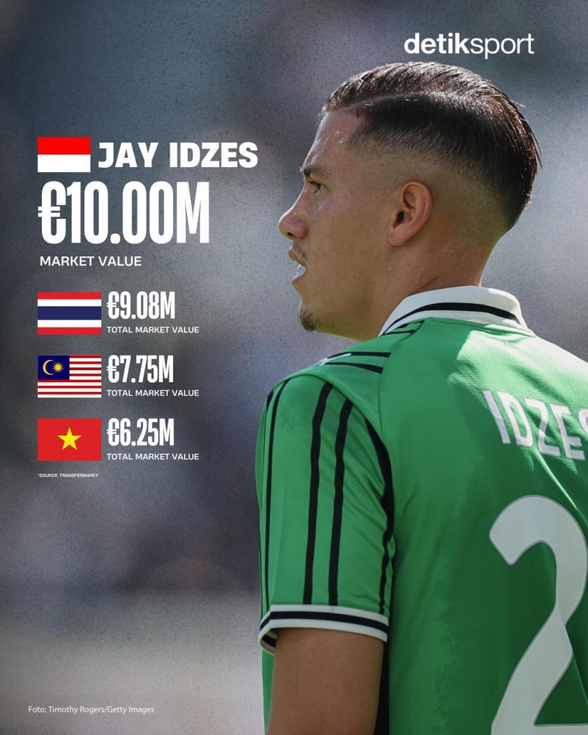 Theo số liệu cập nhật cuối năm 2025, giá trị toàn đội của Thái Lan chỉ vào khoảng 9,08 triệu euro, Malaysia đạt 7,75 triệu euro, trong khi ĐT Việt Nam được định giá 6,25 triệu euro. Điều này đồng nghĩa, riêng Jay Idzes đã có giá trị cao hơn cả một đội tuyển quốc gia từng nhiều lần vô địch AFF Cup như Thái Lan hay đội tuyển Việt Nam, nhà đương kim vô địch Đông Nam Á 2024.