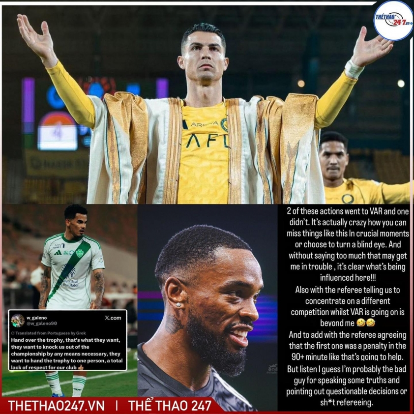 Cristiano Ronaldo cùng Kingsley Coman là hai cầu thủ ghi bàn trong hiệp hai để mang về 3 điểm cực kỳ quan trọng cho Al Nassr trong cuộc đua vô địch Saudi Pro League. Sau trận đấu, Ronaldo tỏ ra vô cùng phấn khích với kết quả này. Tuy nhiên, siêu sao người Bồ Đào Nha cũng tranh thủ lên tiếng về những cáo buộc cho rằng Al Nassr được các trọng tài ưu ái mùa này.