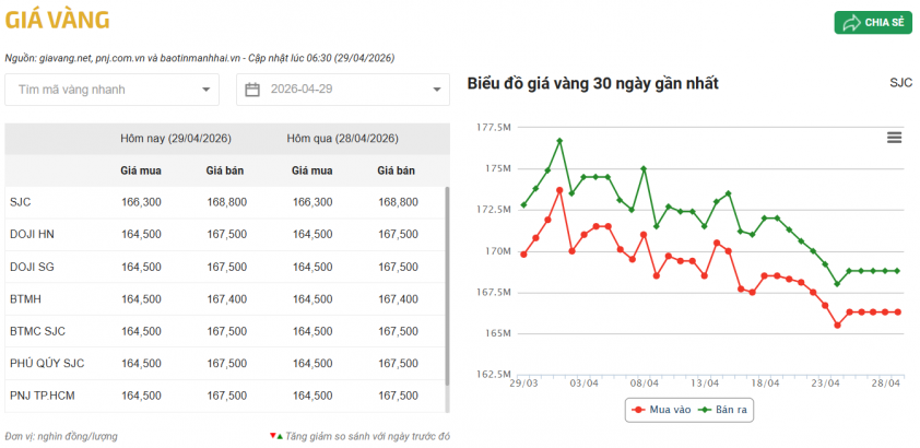 Tính đến sáng ngày 29/4/2026, thị trường vàng trong nước đang duy trì trạng thái ổn định so với phiên giao dịch hôm qua. Cụ thể, tập đoàn SJC đang niêm yết mức giá cao nhất thị trường với 166,3 triệu đồng/lượng (mua vào) và 168,8 triệu đồng/lượng (bán ra). Các ông lớn khác như DOJI (tại cả Hà Nội và TP.HCM), Phú Quý SJC và PNJ TP.HCM đều có sự đồng nhất về mức giá khi niêm yết mua vào ở mức 164,5 triệu đồng/lượng và bán ra tại 167,5 triệu đồng/lượng. Riêng Bảo Tín Minh Hải (BTMH) có mức giá bán ra cạnh tranh hơn đôi chút ở ngưỡng 167,4 triệu đồng/lượng.
