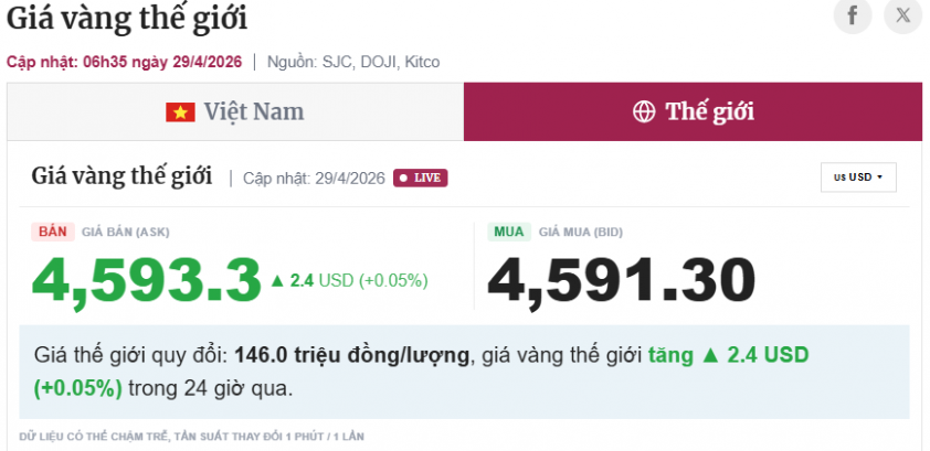 Cập nhật mới nhất vào lúc 06h35 ngày 29/04/2026, giá vàng thế giới đang ghi nhận đà tăng nhẹ trên biểu đồ trực tuyến. Cụ thể, giá vàng giao dịch ở mức mua vào là 4.591,30 USD/ounce và bán ra tại ngưỡng 4.593,3 USD/ounce.