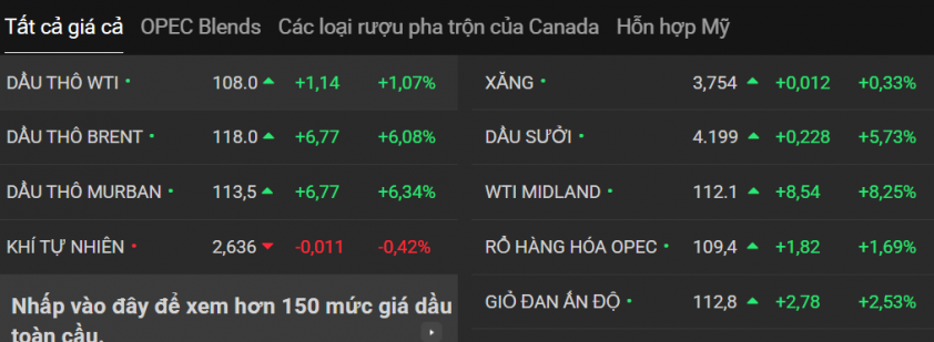 Thị trường năng lượng đang ghi nhận sự biến động mạnh với xu hướng tăng giá bao trùm hầu hết các mặt hàng chính. Cụ thể, dầu thô Brent dẫn đầu mức tăng khi cộng thêm 6,77 USD, tương đương 6,08%, đạt mốc 118,0 USD/thùng. Cùng chung đà tăng ấn tượng này là dầu thô Murban với mức tăng 6,34%, giao dịch tại 113,5 USD. Trong khi đó, dầu thô WTI có mức biến động nhẹ hơn, tăng 1,07% lên mức 108,0 USD.