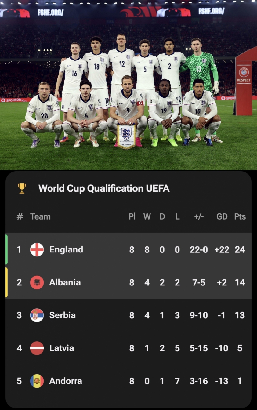Tam Sư giành chiến thắng 2-0 tại Tirana, khép lại vòng loại World Cup với thành tích tuyệt đối: thắng 8/8 trận. Ngôi sao của Bayern Munich đồng thời gửi lời cảnh báo mạnh mẽ tới các đối thủ trước thềm giải đấu tại Bắc Mỹ. Hai bàn thắng trong hiệp 2 giúp Kane nâng tổng số pha lập công cho tuyển Anh lên 78, chính thức vượt qua huyền thoại người Brazil, Pele. Đội tuyển Anh cũng duy trì chuỗi sạch lưới ấn tượng ở vòng loại: 10 trận liên tiếp không thủng lưới, tương đương 1.032 phút.