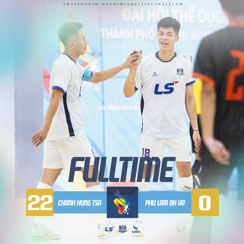 Chánh Hưng Thái Sơn Nam tiếp tục thể hiện sức mạnh vượt trội tại môn futsal ĐH TDTT TP.HCM 2026 khi giành chiến thắng đậm 17-1 trước Phú Định Gia Định, qua đó sớm giành vé vào vòng tứ kết với thành tích cực kỳ ấn tượng: ghi tới 39 bàn chỉ sau 2 trận đấu.