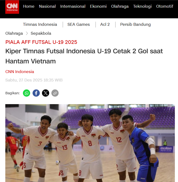 Theo CNN Indonesia, U19 futsal Indonesia đã có “một trận đấu gần như hoàn hảo” trước Việt Nam, đặc biệt trong khả năng tận dụng sai lầm và kiểm soát thế trận ở những thời điểm then chốt. Tờ báo này nhấn mạnh việc Indonesia sớm áp đặt lối chơi tốc độ cao, gây áp lực liên tục khiến hàng thủ Việt Nam thường xuyên rơi vào trạng thái lúng túng. CNN Indonesia bình luận: “Việt Nam nhập cuộc đầy quyết tâm, nhưng Indonesia cho thấy sự khác biệt rõ ràng về cường độ và khả năng chuyển trạng thái.”