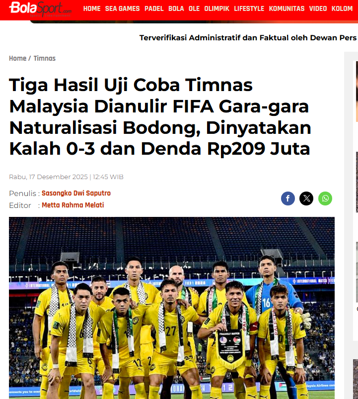 Truyền thông Indonesia lên tiếng việc FIFA xử thua đội tuyển Malaysia 3 trận giao hữu quốc tế với cùng tỷ số 0-3 do sử dụng cầu thủ nhập tịch không đủ điều kiện.