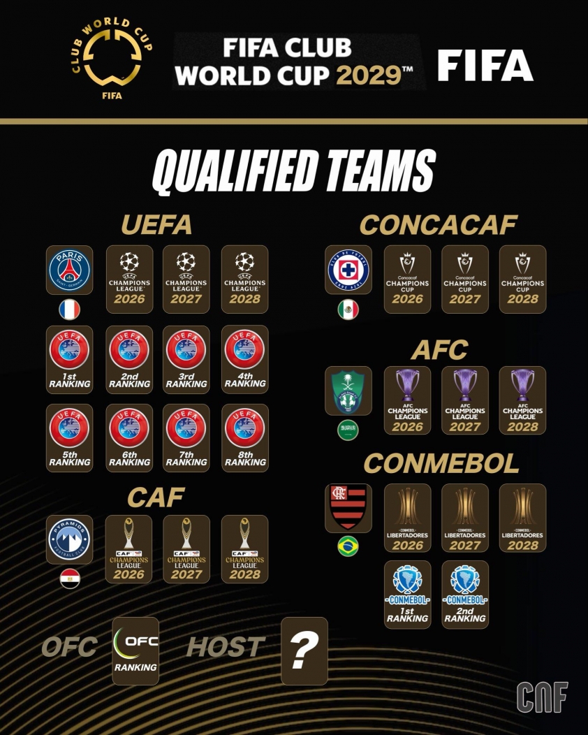 Trong khi đó, FIFA Club World Cup 2029 đã xác định 5 đại diện đầu tiên góp mặt. PSG trở thành CLB châu Âu đầu tiên giành vé nhờ chức vô địch Champions League mùa 2024/25. Flamengo là đại diện Nam Mỹ sau khi đăng quang Copa Libertadores 2025. Cruz Azul đại diện khu vực CONCACAF, Pyramids FC giành suất của châu Phi, còn Al Ahli là đội đầu tiên của châu Á có vé tham dự.
