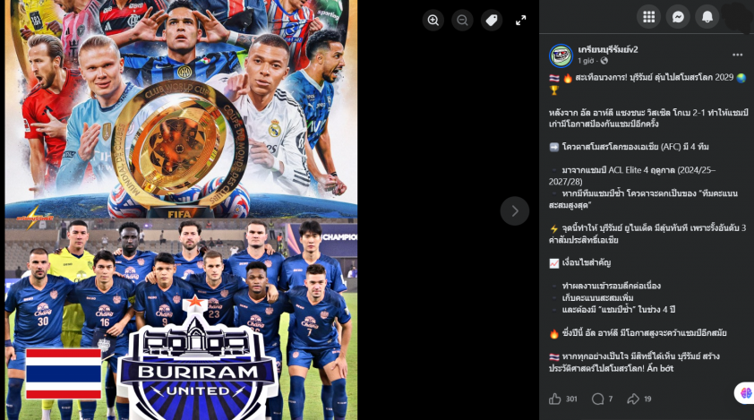 Trang Krian Buriram vừa đăng tải bài viết khẳng định đội bóng hàng đầu xứ chùa vàng đang đứng trước thời cơ lớn để góp mặt ở sân chơi danh giá nhất cấp CLB. Cụ thể, sự chú ý đổ dồn về Buriram United xuất phát từ diễn biến mới nhất tại AFC Champions League Elite. Sau khi Al Ahli ngược dòng đánh bại Vissel Kobe với tỷ số 2-1, đại diện Saudi Arabia sáng cửa bảo vệ chức vô địch. Kịch bản này được đánh giá sẽ tạo lợi thế không nhỏ cho Buriram United trong cuộc đua giành vé đến Club World Cup 2029.