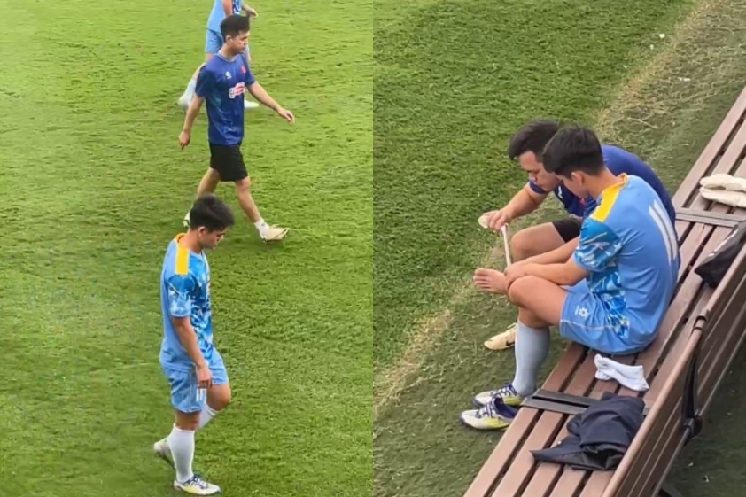 Cụ thể, trong buổi tập sáng 27/3, Văn Khang phải rời sân cùng bác sĩ đội tuyển. Hình ảnh ghi nhận cho thấy cầu thủ thuộc biên chế Thể Công Viettel ngồi ở khu vực ghế, trong khi bác sĩ tiến hành kiểm tra cổ chân trái. Dù chưa có kết luận chính thức về mức độ chấn thương, tình trạng này rõ ràng khiến ban huấn luyện không khỏi lo lắng trong bối cảnh trận gặp Malaysia đang đến rất gần.