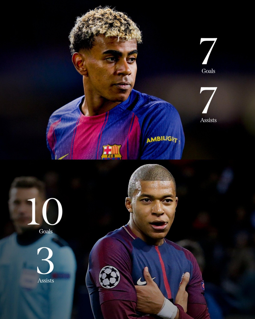 Cụ thể, Yamal hiện đã trở thành cầu thủ có số lần tham gia vào bàn thắng nhiều nhất trước tuổi 18 tại Champions League, với tổng cộng 14 lần tham gia trực tiếp (bao gồm bàn thắng và kiến tạo). Con số này giúp anh vượt qua Mbappe, người từng gây sốt châu Âu trong màu áo PSG. Kỷ lục mới càng củng cố vị thế của Yamal như một trong những tài năng triển vọng nhất bóng đá thế giới hiện nay, đồng thời tăng thêm giá trị chiến thuật của anh trong hệ thống của Hansi Flick.