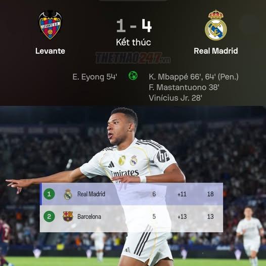 Tại vòng 6 La Liga 2025/26, Real Madrid một lần nữa nối dài mạch thắng khi thắng 4-1 trước Levante ở sân khách. Một lần nữa, Mbappe là ngôi sao tỏa sáng nhất của Real Madrid với 1 cú đúp.