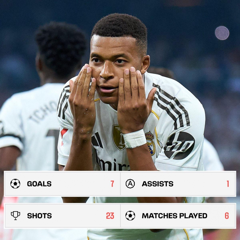 Với 7 bàn thắng và 1 kiến tạo sau 6 trận, Mbappe đang chứng minh mình đang là ngôi sao số 1 của Real Madrid mùa giải này. Nếu tiếp tục duy trì hiệu suất này, Mbappe hoàn toàn có thể một lần nữa cán mốc 30 bàn trong một mùa La Liga.