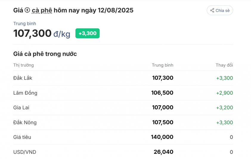 Ngày 12/08/2025, giá cà phê trong nước tiếp tục duy trì đà tăng mạnh, đạt mức trung bình 107.300 đồng/kg, tăng 3.300 đồng so với hôm qua. Tại Đắk Lắk, giá cà phê hiện ở mức 107.300 đồng/kg, tăng 3.300 đồng; Lâm Đồng đạt 106.500 đồng/kg, tăng 2.900 đồng; Gia Lai ghi nhận 107.000 đồng/kg, tăng 3.200 đồng; Đắk Nông dẫn đầu với mức 107.500 đồng/kg, tăng 3.300 đồng.