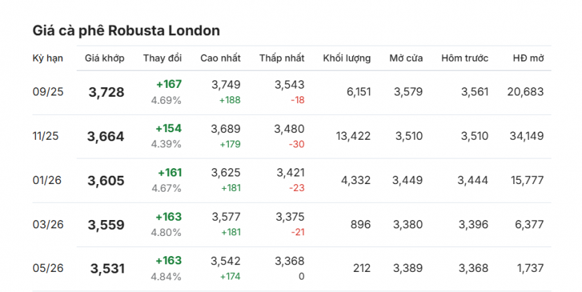 Ngày 12/8/2025, giá cà phê Robusta trên sàn London tiếp tục tăng mạnh ở tất cả các kỳ hạn. Hợp đồng giao tháng 9/2025 tăng 167 USD, đạt 3.728 USD/tấn; tháng 11/2025 tăng 154 USD lên 3.664 USD/tấn; tháng 1/2026 tăng 161 USD lên 3.605 USD/tấn. Các kỳ hạn xa hơn cũng ghi nhận mức tăng đáng kể: tháng 3/2026 tăng 163 USD lên 3.559 USD/tấn, tháng 5/2026 tăng 163 USD lên 3.531 USD/tấn.