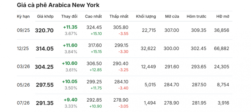 Ngày 12/8/2025, giá cà phê Arabica trên sàn New York đồng loạt tăng ở tất cả các kỳ hạn. Hợp đồng giao tháng 9/2025 tăng 11,35 cent, đạt 320,70 cent/pound; tháng 12/2025 tăng 11,60 cent lên 314,05 cent/pound; tháng 3/2026 tăng 10,60 cent lên 304,25 cent/pound.