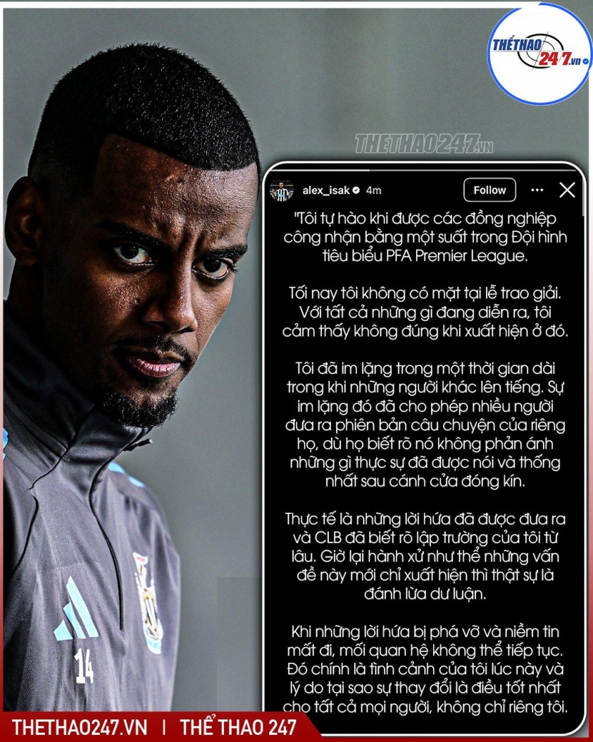 Tối thứ 3, Isak đã chính thức lên tiếng bằng một bài đăng trên Instagram, cho rằng anh đã “im lặng quá lâu để người khác áp đặt câu chuyện của họ”, đồng thời nhấn mạnh “lời hứa đã bị phá vỡ, niềm tin mất đi, và mối quan hệ không thể tiếp tục”. Động thái này khiến dư luận xôn xao, bởi trước đó anh đã kiên quyết đình công, từ chối trở lại tập luyện cùng đồng đội để ép CLB mở đường sang Liverpool.