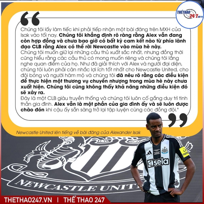 Newcastle ra thông báo đáp trả những thông tin mà Isak chia sẻ trên trang cá nhân và khẳng định sẽ giữ chân ngôi sao 25 tuổi bằng mọi giá.