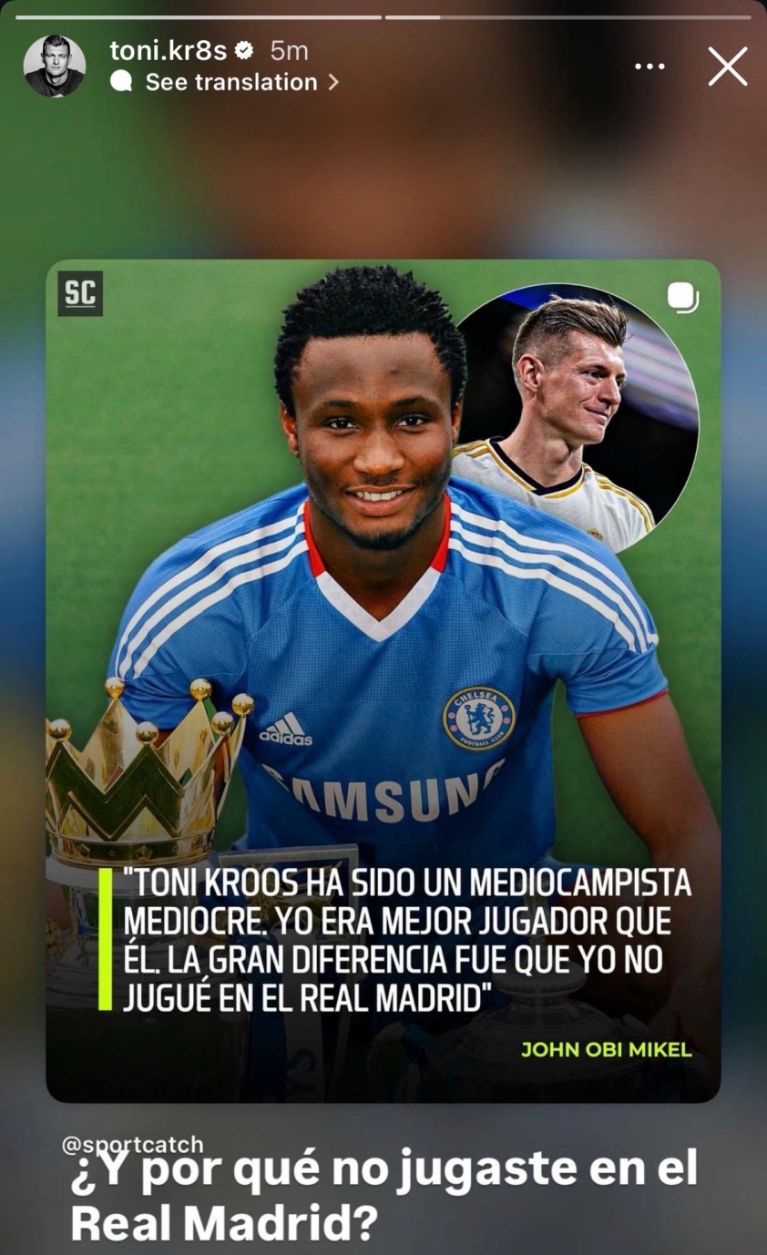 Những ngày qua, mạng xã hội lan truyền phát ngôn được cho là của John Obi Mikel, trong đó cựu tiền vệ Chelsea bị gán cho câu nói hạ thấp Toni Kroos và đề cao bản thân. Cụ thể, Mikel được cho là đã nói: “Toni Kroos chỉ là một tiền vệ tầm thường. Tôi còn là cầu thủ tốt hơn anh ta. Khác biệt lớn nhất là tôi không chơi cho Real Madrid.” Thông tin nhanh chóng bị nhiều trang tin khai thác, đẩy câu chuyện đi xa khỏi kiểm chứng ban đầu.