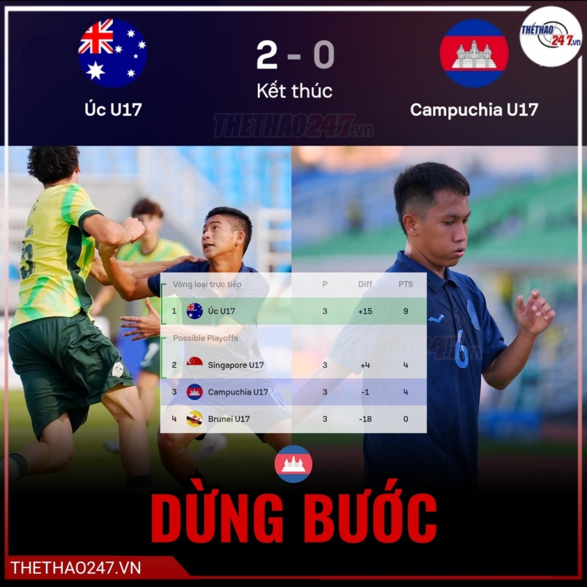 Với thể thức chỉ chọn 3 đội nhất bảng và 1 đội nhì có thành tích tốt nhất vào bán kết, kịch bản Australia đứng nhì bảng C đó từng khiến cuộc cạnh tranh suất dành cho các đội nhì bảng trở nên căng thẳng, đặc biệt với các đội ở bảng A và B. Tuy nhiên, thực tế trên sân đã không diễn ra theo hướng bất lợi ấy. Campuchia không thể tạo bất ngờ trước đối thủ vượt trội, và kết quả này vô tình mở ra lợi thế rõ rệt cho U17 Việt Nam trong cuộc đua giành vé vào bán kết trong trường hợp đoàn quân áo đỏ không thể giành vị trí nhất bảng A.