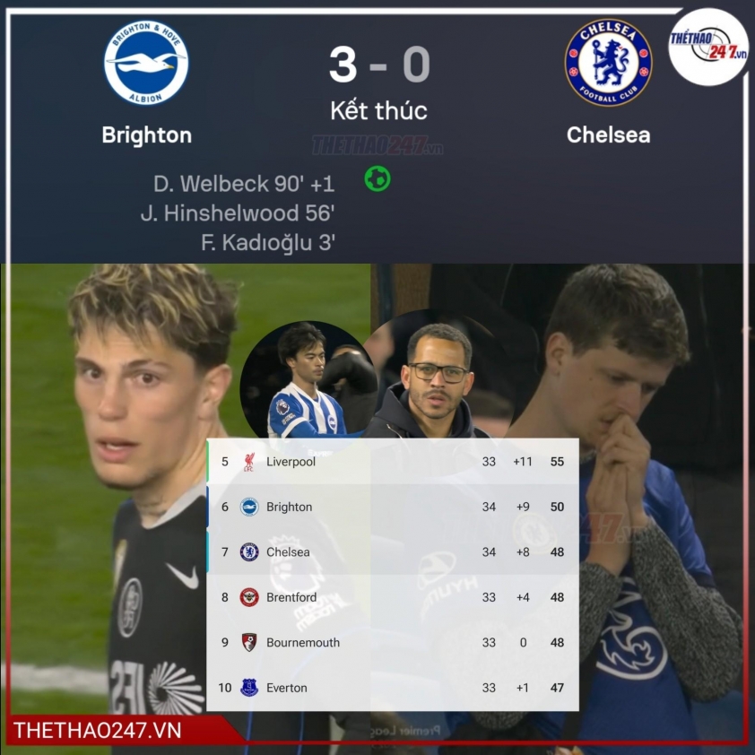 Chiến thắng trở nên hoàn hảo hơn cho Brighton khi Danny Welbeck ghi bàn trong thời gian bù giờ. Với 6 chiến thắng trong 8 trận gần nhất, đội bóng này đang sáng cửa giành vé dự cúp châu Âu mùa tới. Ngược lại, Chelsea chìm sâu trong khủng hoảng với 5 trận thua liên tiếp tại Premier League – lần đầu kể từ năm 1993 và chuỗi tịt ngòi dài nhất trong 114 năm, đặt dấu hỏi lớn cho tương lai của HLV Liam Rosenior trước trận bán kết FA Cup gặp Leeds United trên sân Wembley Stadium.
