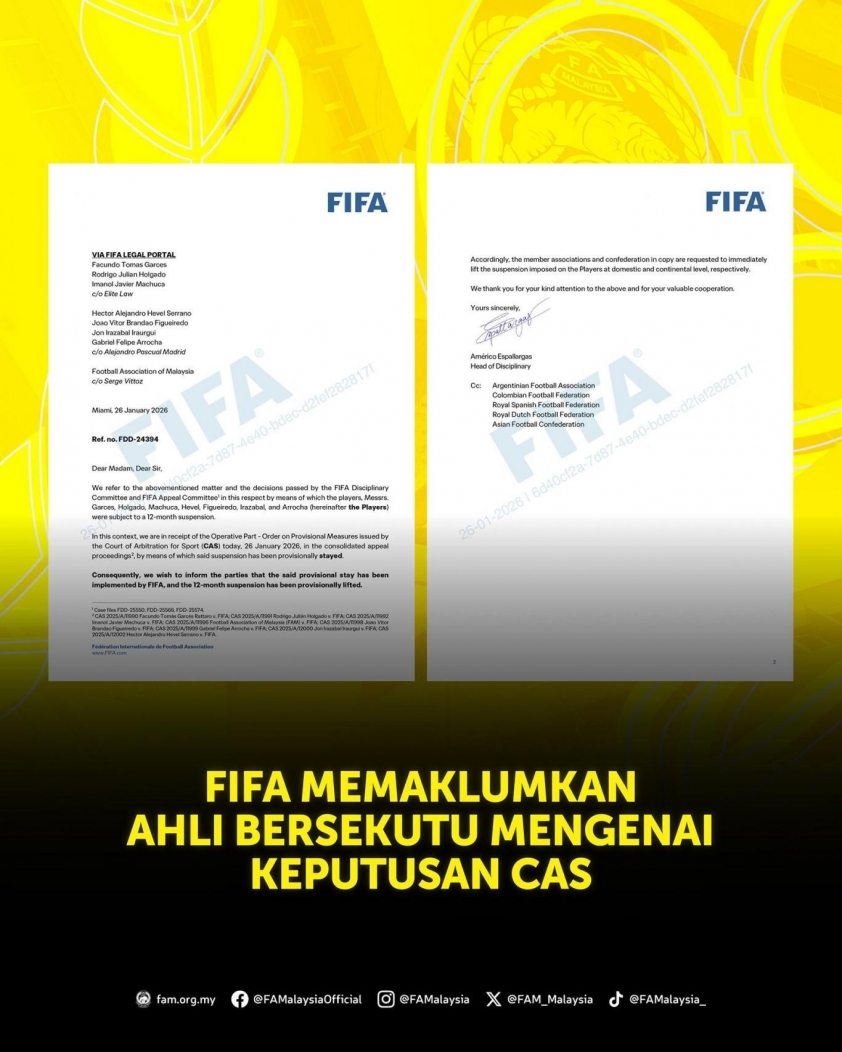 Liên đoàn Bóng đá Malaysia (FAM) xác nhận đã nhận văn bản từ FIFA, thông báo tạm dừng thi hành án phạt đối với bảy cầu thủ nhập tịch. Quyết định này được đưa ra sau khi Tòa án Trọng tài Thể thao (CAS) chấp thuận đơn xin hoãn án, cho phép nhóm cầu thủ tiếp tục thi đấu trong thời gian chờ phán quyết cuối cùng.