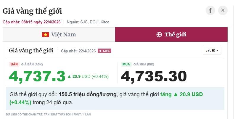 Cập nhật lúc 08h15 ngày 22/04/2026, giá vàng thế giới ghi nhận xu hướng tăng nhẹ so với phiên trước. Cụ thể, giá bán (ask) đạt 4.737,3 USD/ounce, tăng 20,9 USD, tương đương +0,44% trong 24 giờ qua. Ở chiều mua vào (bid), giá hiện ở mức 4.735,30 USD/ounce.