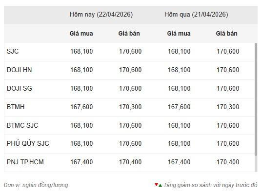 Giá vàng trong nước ngày 22/04/2026 tiếp tục duy trì ở mức cao, với biến động không đáng kể so với phiên trước đó. Theo bảng niêm yết, các thương hiệu lớn như SJC, DOJI hay PNJ đều giữ nguyên mức giá mua vào – bán ra, cho thấy thị trường đang trong trạng thái ổn định.