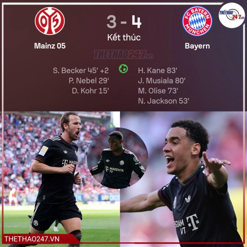 Bước ngoặt đến sau giờ nghỉ, khi Bayern thay đổi hoàn toàn bộ mặt. Nicolas Jackson rút ngắn tỷ số ở phút 53, trước khi Michael Olise và Jamal Musiala liên tiếp ghi bàn đưa trận đấu về thế cân bằng. Áp lực dồn dập khiến Mainz không thể đứng vững, mở ra cơ hội cho màn lội ngược dòng ngoạn mục.
