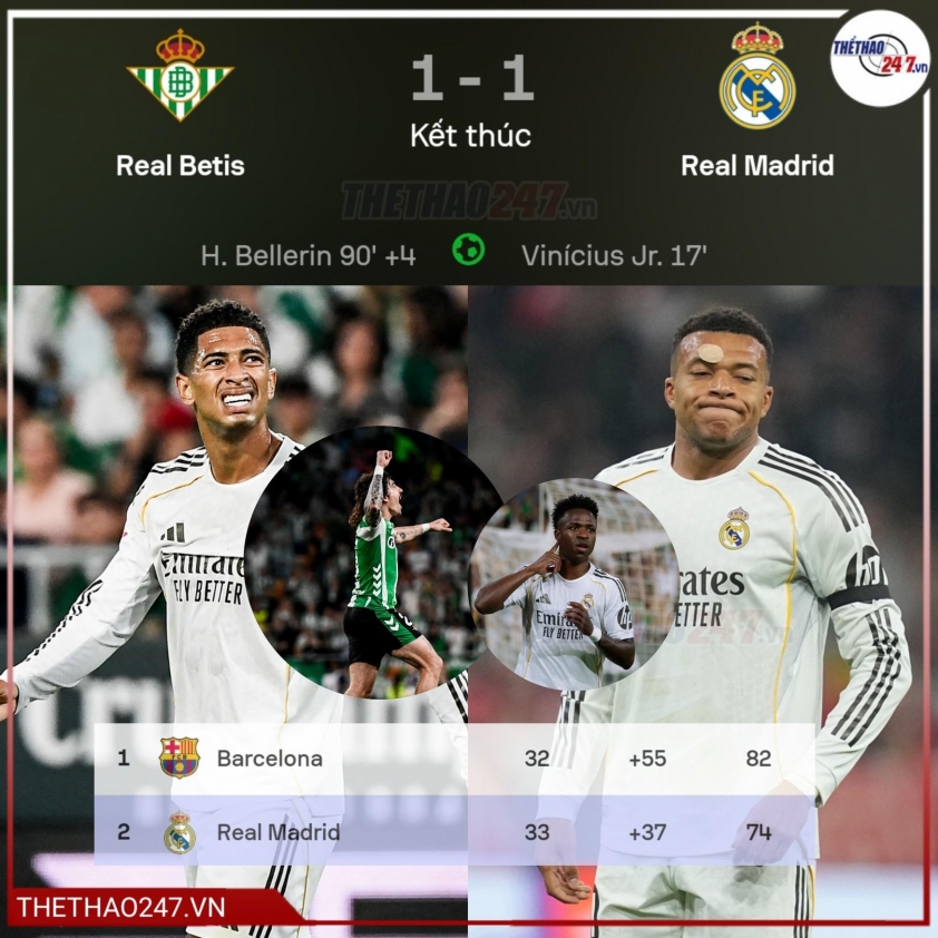 Trước Betis, Real Madrid từng có lợi thế khi Vinícius Júnior mở tỷ số từ sớm, nhưng sự thiếu chắc chắn ở những phút cuối đã khiến họ trả giá. Bàn gỡ ở phút 94 không chỉ lấy đi 2 điểm quý giá mà còn đẩy đội bóng vào thế khó khi đã kém Barcelona tới 8 điểm trên bảng xếp hạng trong khi đã thi đấu nhiều hơn một trận.