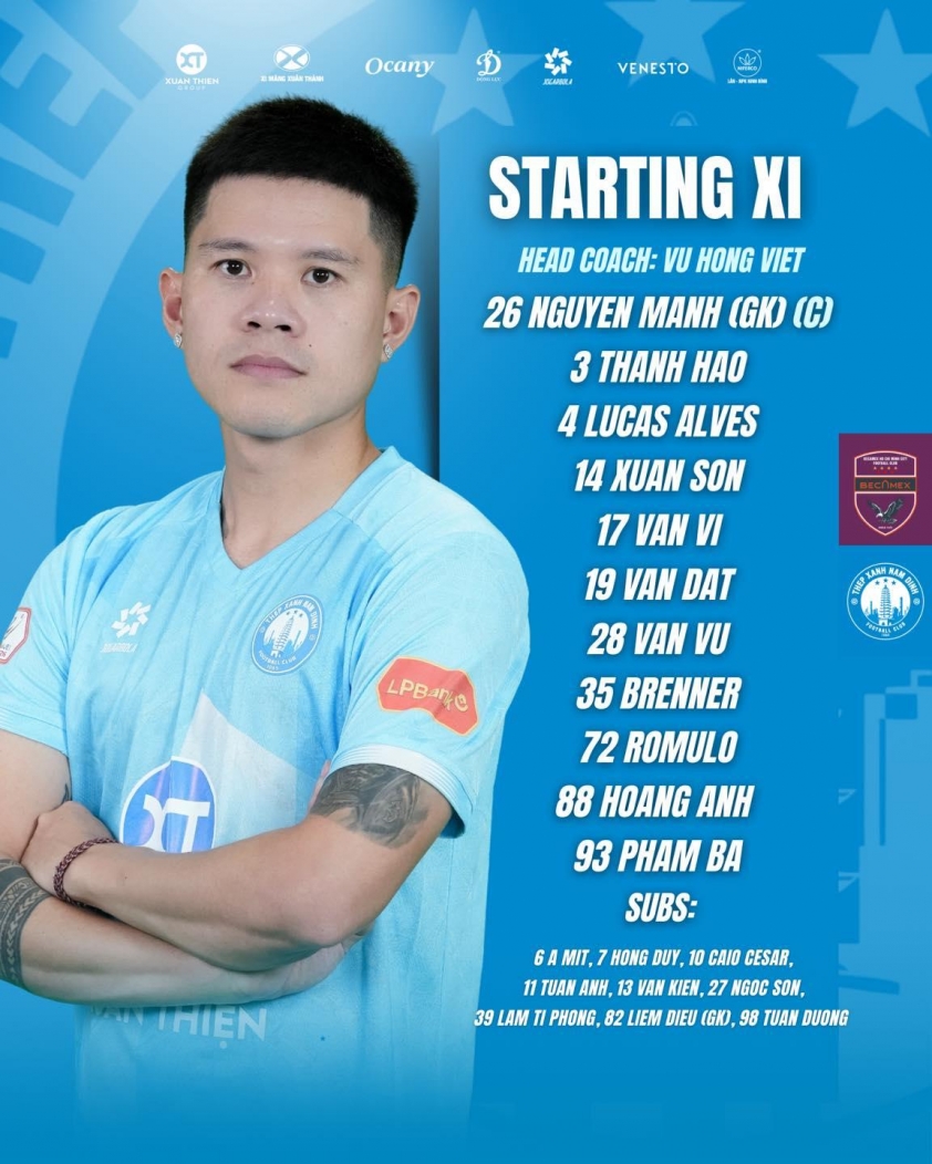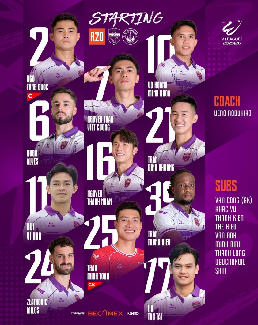 - Becamex TP.HCM: Minh Toàn; Tùng Quốc, Tuấn Cảnh, Đình Khương, Milos, Tấn Tài, Minh Khoa, Alves Hugo, Hồng Quân, Việt Cường, Oduenyi.