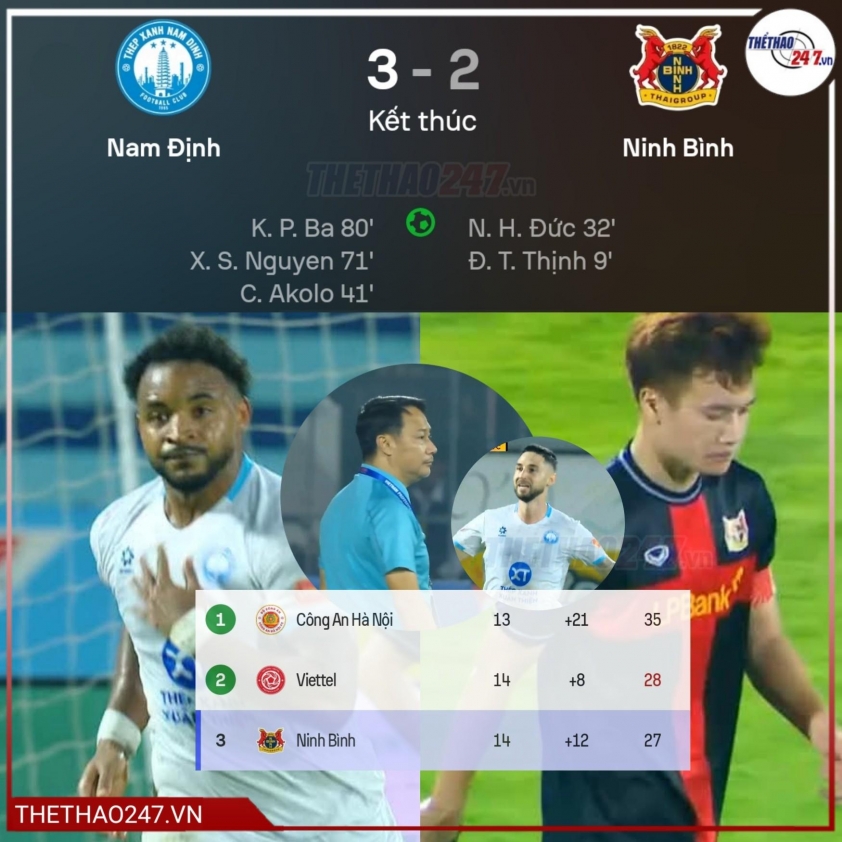 (Kết quả bóng đá) - Nam Định lội ngược dòng ngoạn mục, đánh bại Ninh Bình 3-2 sau màn rượt đuổi tỷ số hấp dẫn và giàu kịch tính đến những phút cuối.