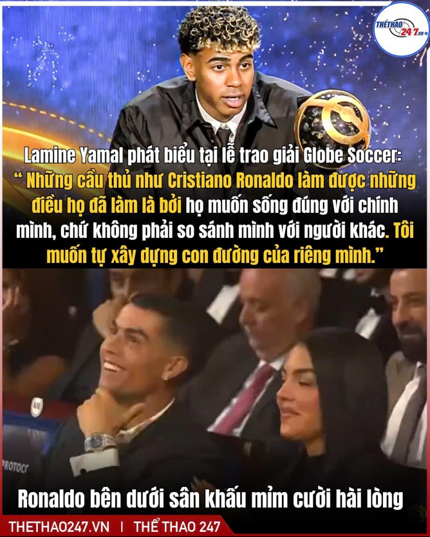 Trên bục phát biểu, Yamal không nói nhiều về thành tích hay mục tiêu cá nhân, mà chia sẻ quan điểm phát triển sự nghiệp theo cách riêng, với một chi tiết khiến cả khán phòng đặc biệt chú ý. Chính từ đây, khoảnh khắc gây “bão” mạng xã hội xuất hiện. Khi Yamal nhắc đến Cristiano Ronaldo, máy quay lập tức hướng về hàng ghế đầu. Siêu sao người Bồ Đào Nha mỉm cười, gật đầu đầy hài lòng bên cạnh vợ Georgina Rodriguez, tạo nên bức ảnh đang lan truyền với tốc độ chóng mặt trên các nền tảng.