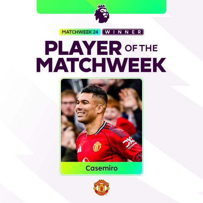 Casemiro vừa được bầu chọn là Cầu thủ xuất sắc nhất vòng đấu Premier League (do fan bình chọn) sau màn trình diễn nổi bật trong chiến thắng 3-2 của Manchester United trước Fulham. Tiền vệ người Brazil ghi một bàn thắng quan trọng và đóng góp một pha kiến tạo, trực tiếp tạo khác biệt cho đội bóng thành Manchester trong trận cầu giàu cảm xúc cuối tuần qua.