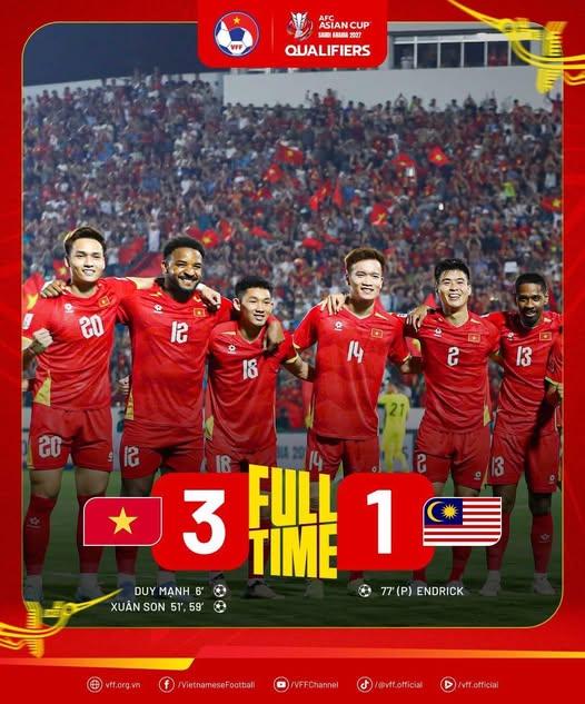 Bước sang hiệp hai, Xuân Son trở thành tâm điểm với cú đúp đánh đầu liên tiếp, giúp Việt Nam dẫn trước 3-0. Malaysia chỉ có thể gỡ lại một bàn trên chấm phạt đền do công của Endrick sau pha phạm lỗi của Văn Hậu. Chung cuộc, chiến thắng 3-1 không chỉ giúp Việt Nam đứng đầu bảng mà còn giành vé dự VCK Asian Cup 2027 một cách thuyết phục.