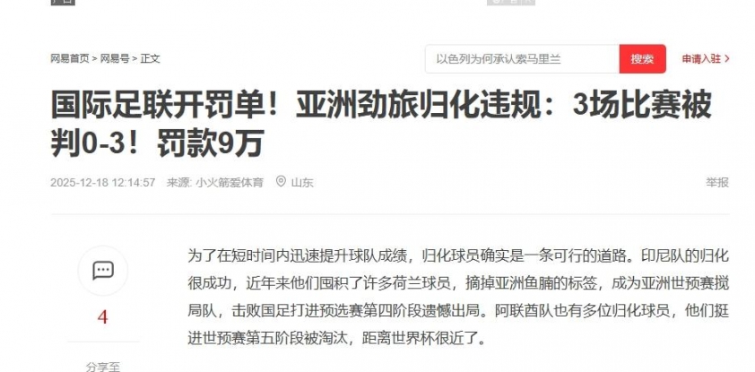 Mở đầu bài viết, tờ 163 (Trung Quốc) đặt ngay dòng tít “FIFA ra án phạt! Đội bóng mạnh châu Á vi phạm nhập tịch: 3 trận bị xử thua 0-3, phạt tiền 90.000 Nhân dân tệ”, nhằm nhấn mạnh mức độ nghiêm trọng của án phạt mà FIFA đưa ra cho bóng đá Malaysia. Theo truyền thông Trung Quốc, đây không chỉ là xử lý mang tính thủ tục, mà là động thái mang thông điệp mạnh mẽ từ FIFA.