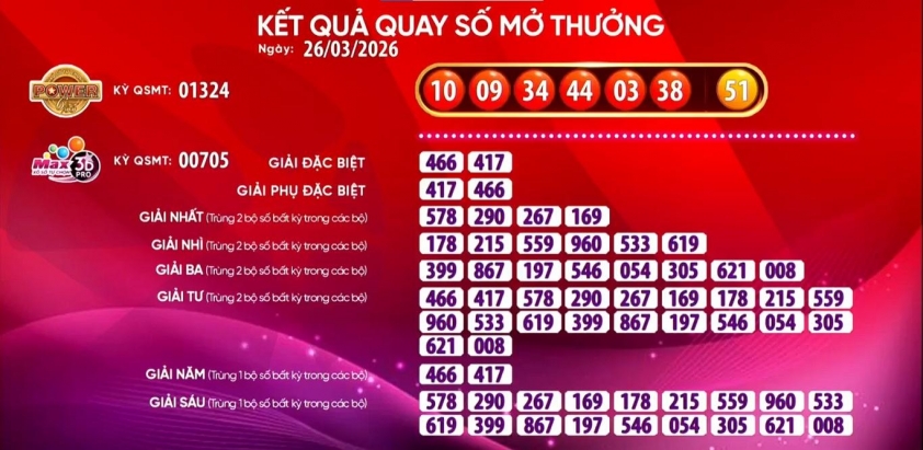 Vietlott 26/3/2026 - Kết quả xổ số Vietlott Power 6/55 ngày 26/3/2026