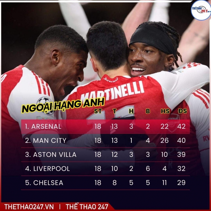 Sau vòng 18, Ngoại hạng Anh bước vào giai đoạn mà cục diện ngôi đầu được khoanh vùng rõ rệt. Arsenal, Man City và Aston Villa cùng giành chiến thắng, tạo thành thế “tam mã” bám đuổi sít sao. Khoảng cách điểm số không lớn khiến mỗi vòng đấu tiếp theo đều mang ý nghĩa then chốt.