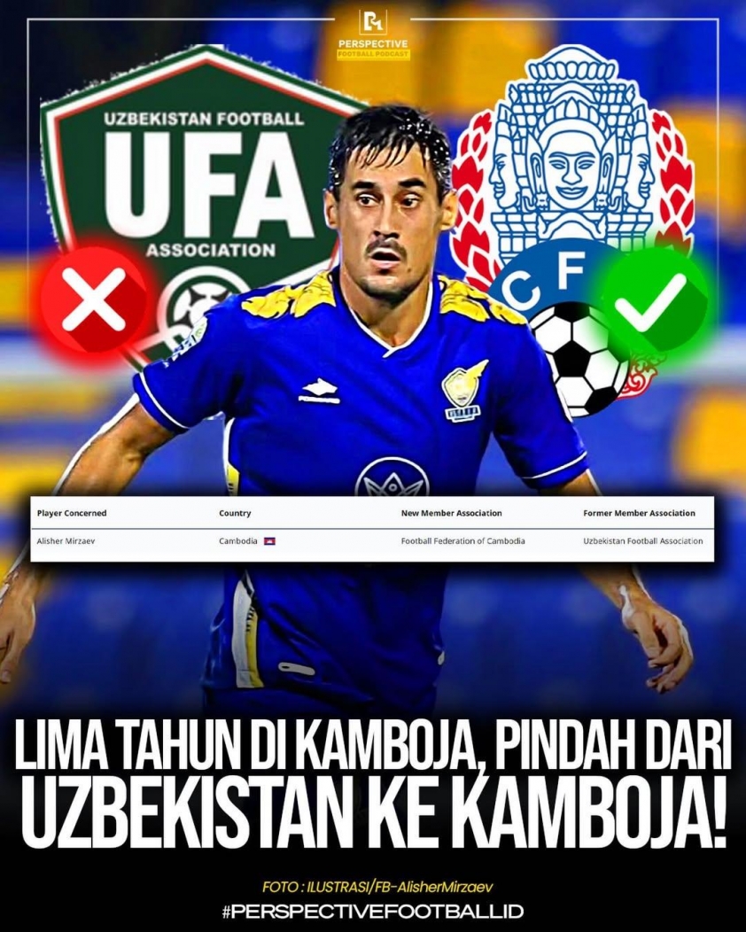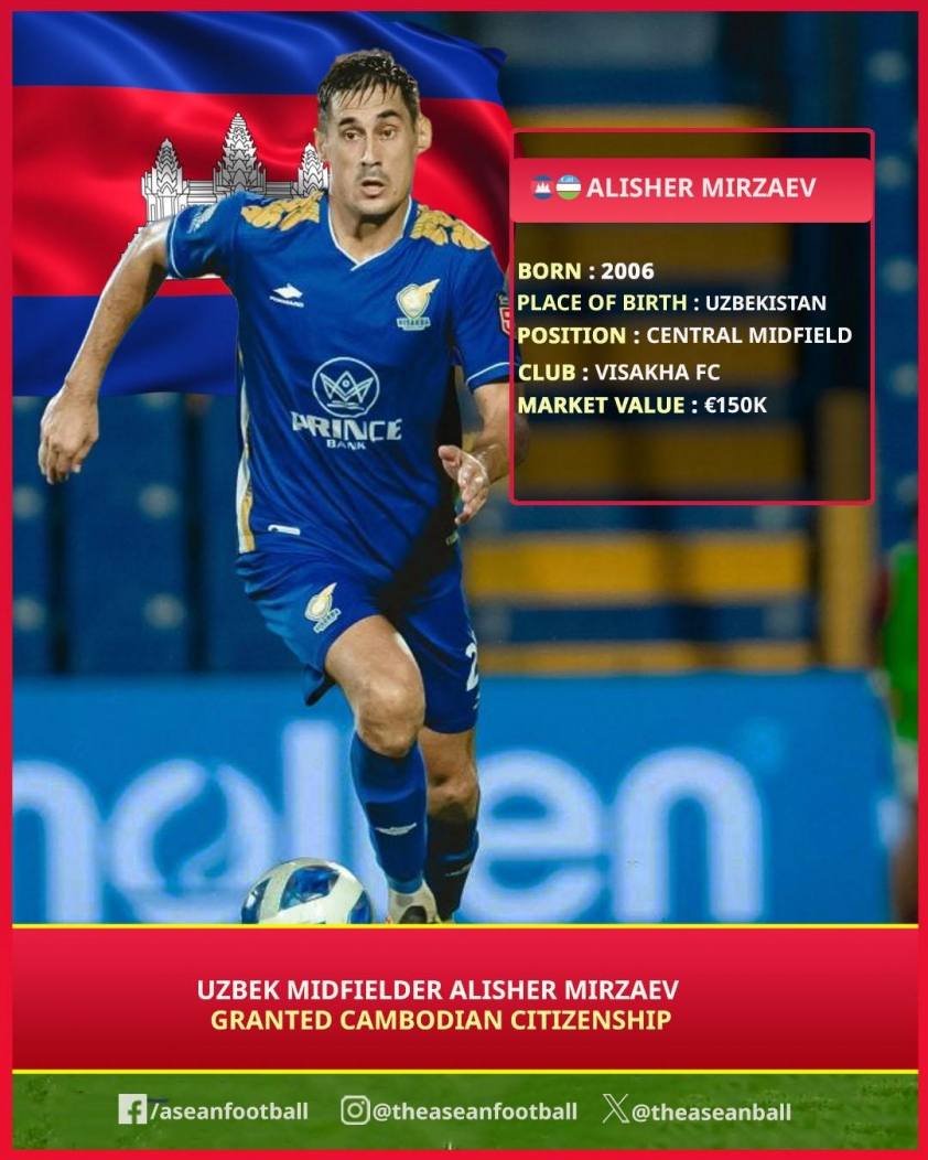 Theo thông tin mới nhất, Campuchia vừa tăng cường thêm sức mạnh cho hàng tiền vệ một lần nữa bằng cách nhập tịch Alisher Mirzaev, tiền vệ gốc Uzbekistan, 29 tuổi đang thi đấu cho Visakha FC. Cầu thủ đã chính thức nhận được quốc tịch Campuchia sau khi trải qua quãng thời gian thi đấu 6 năm tại Campuchia.