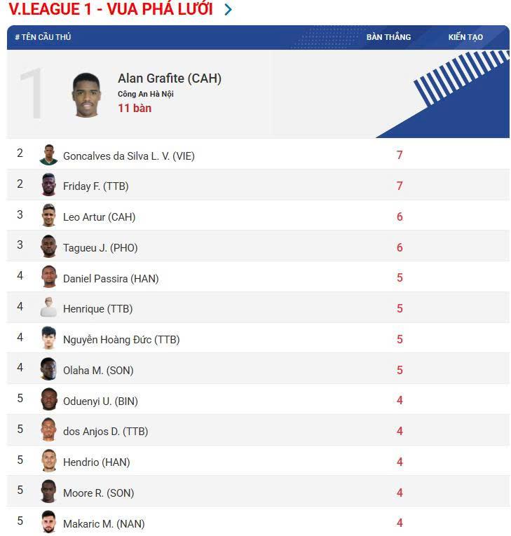 Cuộc đua Vua phá lưới gần như là “sân chơi riêng” của các ngoại binh. Alan Sebastiao Alexandre dẫn đầu với 11 bàn thắng cho Công an Hà Nội, bỏ xa phần còn lại. Theo sau là những cái tên như Imoh Fred Friday, Tagueu Tadjo, Lucas Vinicius hay Leonardo Artur – tất cả đều là tiền đạo ngoại. Trong nhóm cầu thủ ghi từ 4 bàn trở lên, duy nhất Nguyễn Hoàng Đức góp mặt, nhưng anh lại là một tiền vệ trung tâm.
