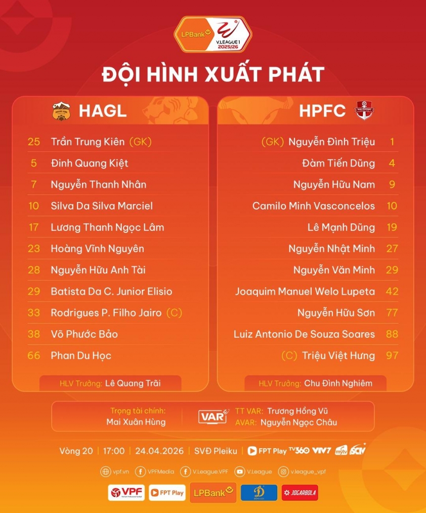 Đội hình ra sân HAGL vs Hải Phòng: