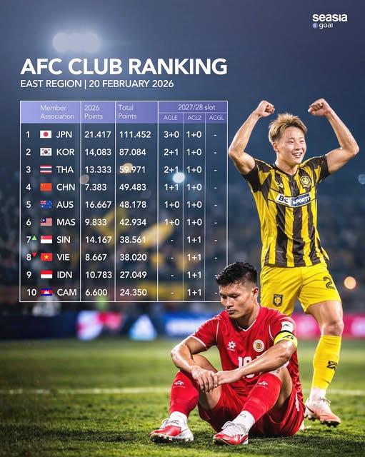 Áp lực chưa dừng lại khi Indonesia đang bám sát phía sau, còn Thái Lan duy trì vị thế dẫn đầu khu vực Đông Nam Á với 59.971 điểm, xếp thứ 7 châu Á. Sự chênh lệch cho thấy bóng đá Việt Nam đang đứng trước nguy cơ tụt lại nếu không cải thiện thành tích ở cấp CLB trong những mùa tới.