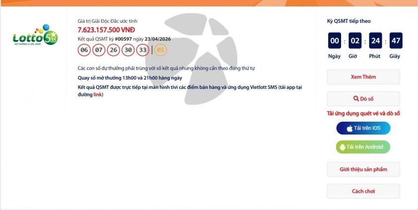 Vietlott 24/4/2026 - Kết quả xổ số Vietlott Mega 6/45 ngày 24/4/2026