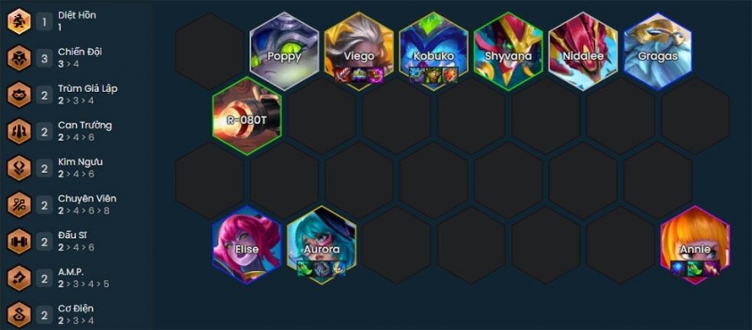 Các tướng: Poppy, Nidalee, Shyvana, Elise, Gragas, Annie, Viego, Kobuko và Aurora level 9