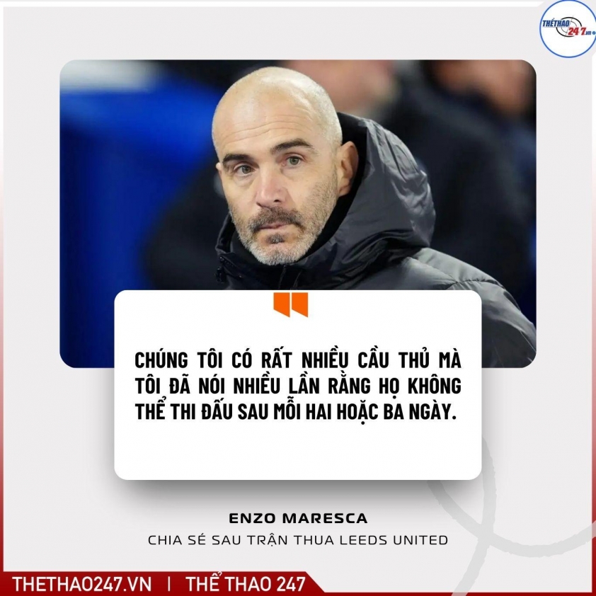 HLV Enzo Maresca thừa nhận Chelsea không còn đủ lực để duy trì phong độ ổn định khi lịch thi đấu dày đặc buộc nhiều trụ cột phải ngồi ngoài, dẫn đến thất bại 1-3 trước Leeds United.